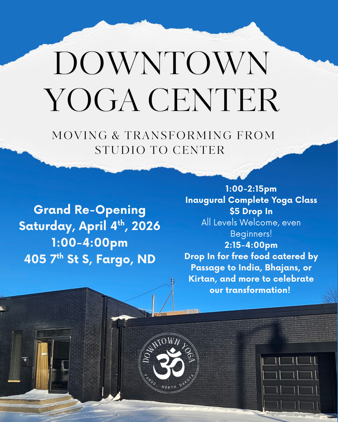 Join us for our Grand Re-Opening at our New Location on Saturday, April 4th, 2026! Register for our Inaugural $5 Community Yoga class from 1-2:15pm and/or stop by from 2:30-4pm for free food catered by Passage to India and more!